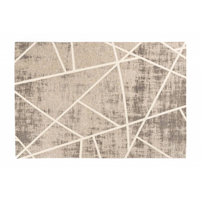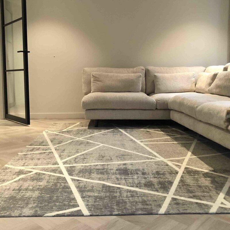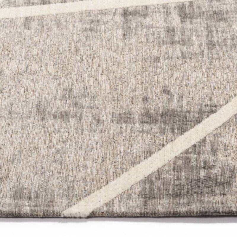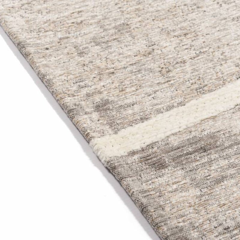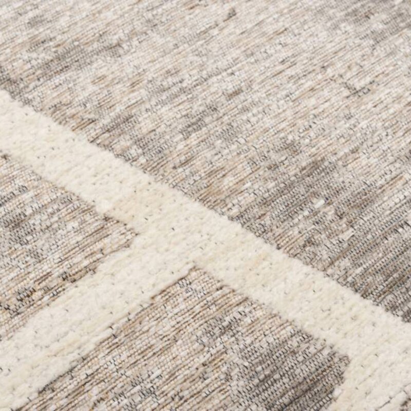 Die Basis dieses Teppichs ist in einem neutralen Steingrau gehalten, während das Muster in einem hellen Crème/Weiß gewebt ist.