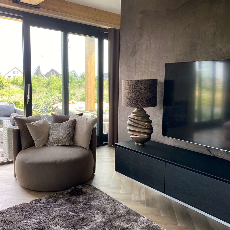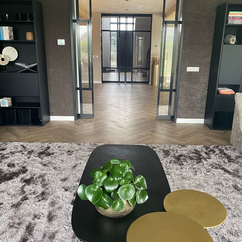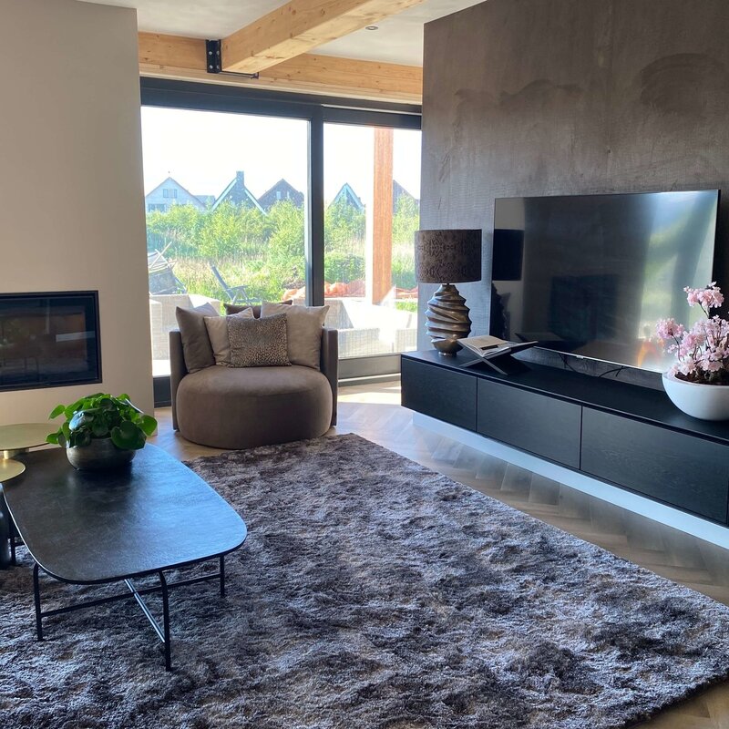 Dieser luxuriöse Hochflorteppich wurde von dem berühmten Couturier "Mart Visser" entworfen. Charakteristisch für diesen Teppich ist die Samtoptik mit leicht glänzenden Garnen. Dieser Teppich hat eine Mischung aus dunkel- und hellgrauen Garnen und braunen Garnen. Dies zusammen gibt dem Teppich einen grau/braunen Farbton mit der Betonung auf braun.