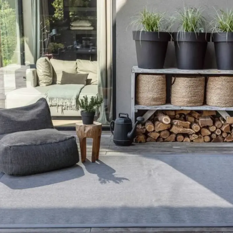 Der Teppich besteht aus 100 % Polypropylen und ist somit ein idealer Outdoor-Teppich. Polypropylen hat die Eigenschaften, dass es ein unverwüstliches synthetisches Garn ist, das feuchtigkeitsbeständig ist und UV-Strahlen widerstehen kann.