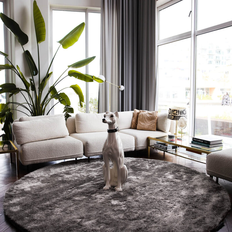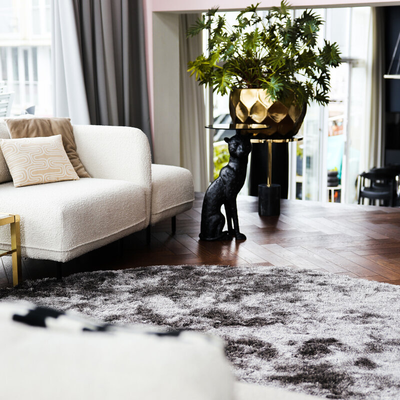 Dieser luxuriöse Hochflorteppich wurde von dem renommierten Modeschöpfer "Mart Visser" entworfen. Charakteristisch für diesen Teppich ist die Samtoptik mit leicht glänzenden Garnen. Dieser Teppich hat eine wunderbare Mischung aus hell- und dunkelgrauen und braunen Naturtönen des Garns. Dies zusammen gibt dem Teppich einen warmen braun-grauen Touch.
